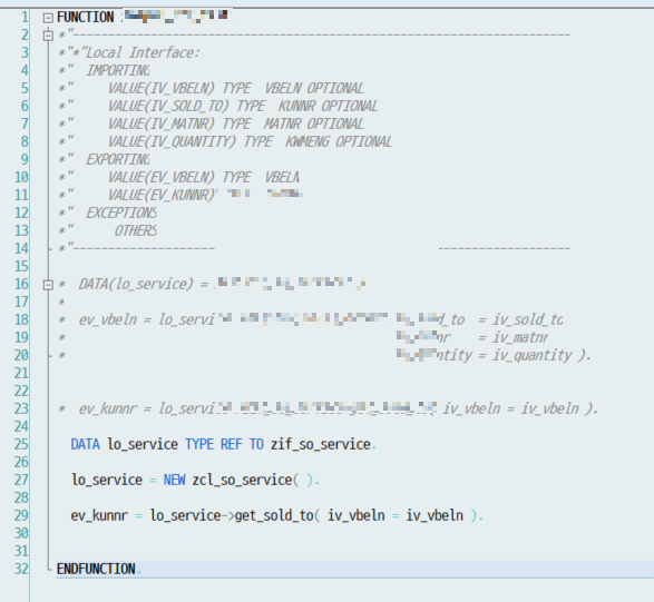 1. FM에서 인터페이스 참조를 통한 접근2. 인터페이스 왜 사용하는 경우 예시1. FM에서 인터페이스 참조를 통한 접근 CLASS에 'ZIF_SO_SERVICE' 라는 인터페이스를 만들었다. 더블클릭해서 'GET_SOLD_TO' 라는 메소드를 생성했다. CLASS > METHOD 탭에 가보면 인터페이스에 정의했던 메소드를 확인할 수 있다. 이제 Function Module에서 이 메소드를 호출해본다.25: 인터페이스 타입으로 객체(lo_service)를 선언한다.27: 실제 구현체(Class)를 할당한다.29: lo_service에 인터페이스에 정의된 메소드를 사용할 수 있다. 다른 클래스를 생성해서 똑같은 인터페이스를 사용하게 되면?... 어디보자 새로 ZCL_SO_SERVICE2 라는 클래스를..